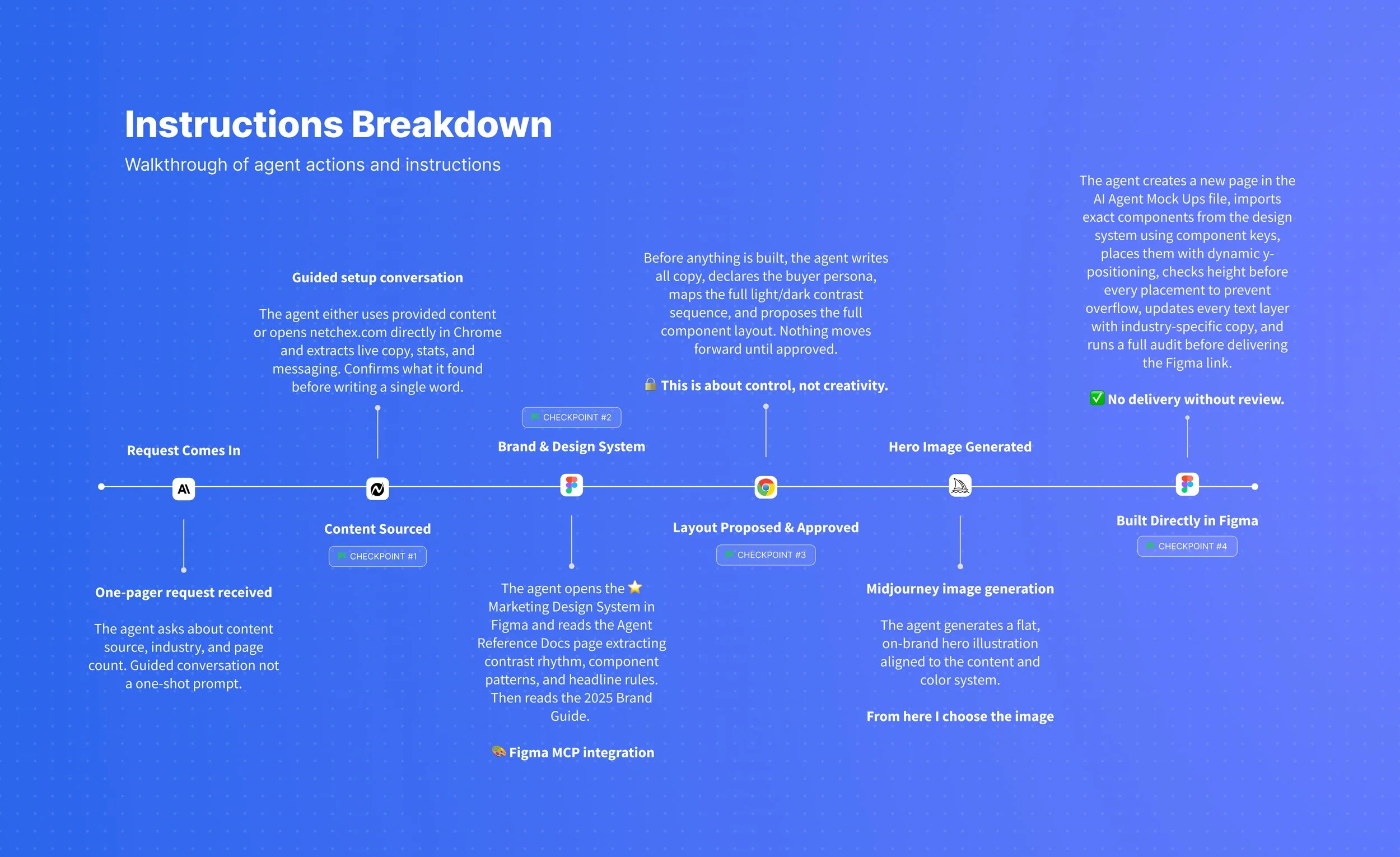 Wired it to netchex.com for live copy extraction, our Figma design system for real components, and Midjourney for on-brand image generation