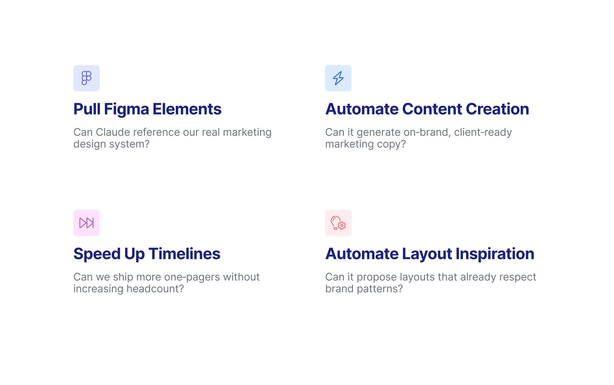 Each one following similar patterns but still requiring a full spin-up: research, copy, layout, brand checks. The work was repetitive but too detail-sensitive to cut corners on. It was eating time we didn't have.